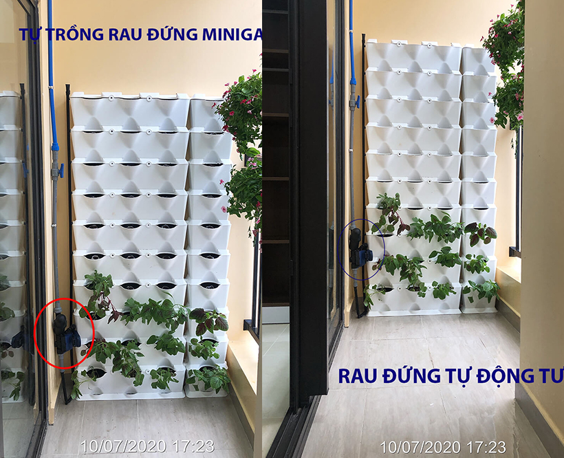 Trong hình kích thước ban công trồng rau đứng Minigarden là 2m2 gồm Ngang 1m (Module đứng + Module ONE) x Cao 2M (tổng 10 tầng) xếp chồng lên nhau. Có tưới nhỏ giọt cho từng hốc rau và bộ hẹn giớ tưới của Israel