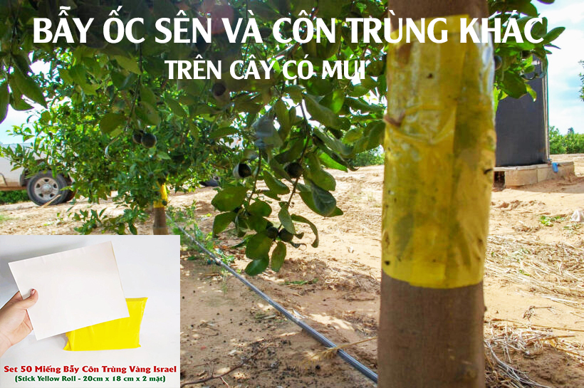 - Nếu bẫy ốc sên cho cây cam thì nên cuộn bẫy vàng Israel quanh gốc cây cam, cách mặt đất 50cm – 80cm (1 cây cam nên cuộn 1 miếng bẫy vàng và sử dụng trên 6 tháng chịu mưa nắng và nước tưới)