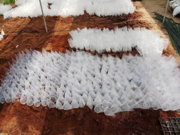 Mua xơ dừa đổ 1 đống nhỏ ,rồi vùi ly nhựa giâm cành vào đó. Tưới nước đóng xơ dừa hằng ngày, Bên trên dùng lưới che mát cho lan loại che bớt 50%-70% nắng.