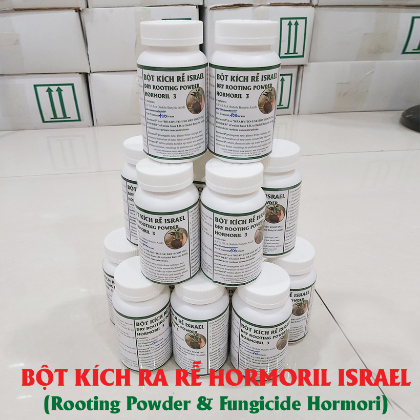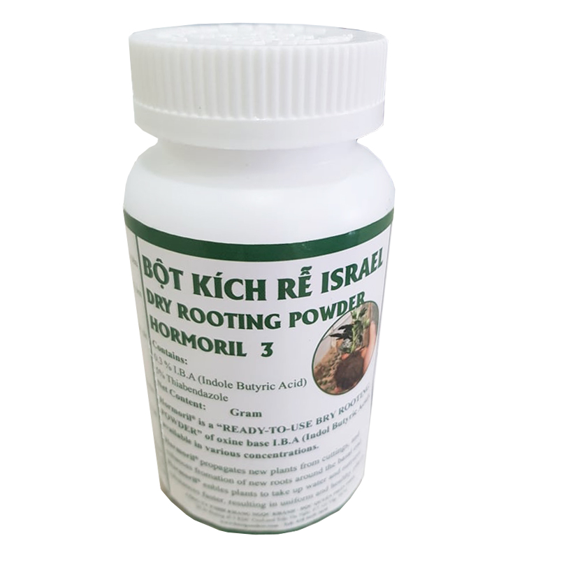 Bột kích rễ Israel cho cây thân mềm, thân thảo Hiệu Hormoril 3 dùng kích thích ra rễ, giúp rễ cây phát triển nhanh và đạt tỷ lệ thành công trên 90%. Đặc biệt sử dụng bột kích thích ra rễ cho cây con, cây mầm, giấm chiết cành. Khối lượng: 100 gram/Lọ