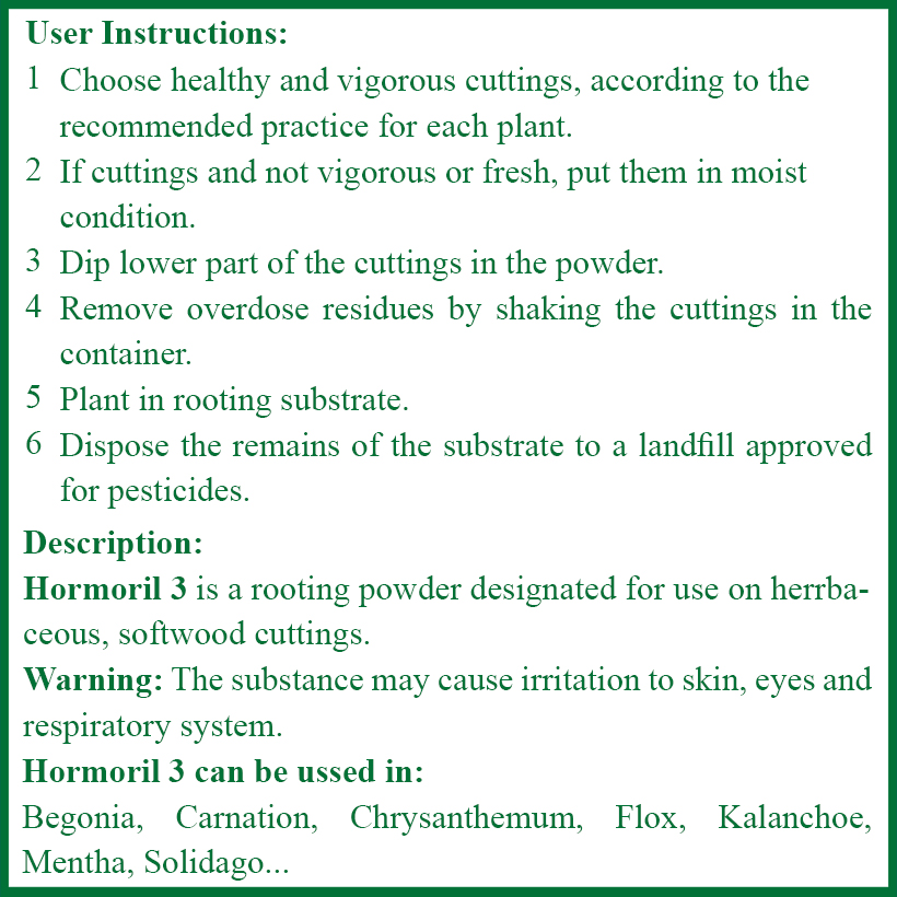 - HORMORIL T-3 (bột rễ có chứa thành phần ngăn nấm): T with fungicide cực kỳ quan trọng đối với một số giống cây giâm cành nhạy cảm với vi khuẩn bên ngoài. Vì vậy, tùy loại cây cần giâm cành mà nhà vườn chọn lựa Homoril 3 hay Homoril T3 phù hợp.
