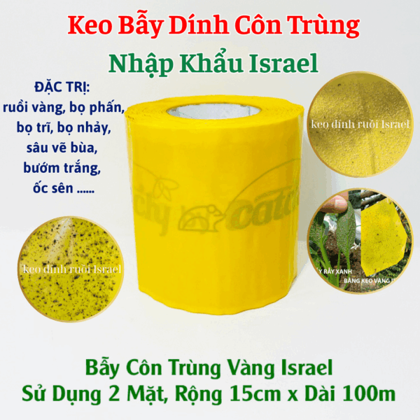 - Keo Dính vàng Bẫy Côn Trùng Israel (Cuộn 100 mét ) dùng trong nông nghiệp sạch để bẫy Ruồi đục các loại, Bẫy Bọ Phấn trắng, Bọ trĩ, Bọ nhảy, Sâu vẽ bùa và ốc sên. Bảo hành 4 tháng đến 6 tháng chịu mưa nắng và nước tưới