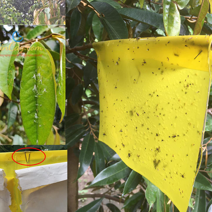 + Đặc biệt, với cây sầu riêng dùng diệt rầy trắng, rầy nhảy, rầy xanh … chỉ cần cắt thành từng miếng nhỏ và treo bẫy màu “trên đường bay của côn trùng”. Cụ thể rầy trắng thì nên treo dưới các tán lá sầu riêng. Với 1.000m2 chỉ cần 30m – 50m bẫy màu (trung bình 1 cây sầu riêng tầm 5 đến 8 miếng)