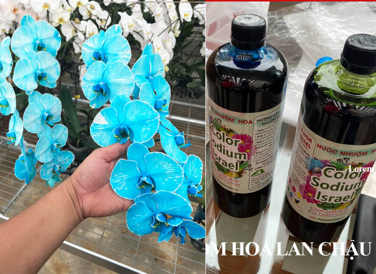 Với nguyên liệu nước màu nhuộm hoa công nghệ Israel (dạng nước) chai 1L được đưa vào sử dụng và thu được kết quả tốt. Điều quan trọng là sự cần mẫn và tỷ mỹ yêu nghề của nhà vườn trồng hoa lan chậu, chịu thử nghiệm và thu được thành công