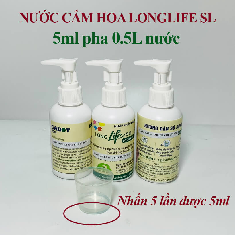 Nước Cắm hoa Longlife SL nhập khẩu Isarel với Chai 100ml dùng tiết kiệm giúp hoa cắm bình tại nhà tươi lâu gấp 2 làn và 15 ngày không cần thay nước mới. 1 nhấn bình pha 0.5L nước. Chai 100ML pha 10L nước cắm hoa
