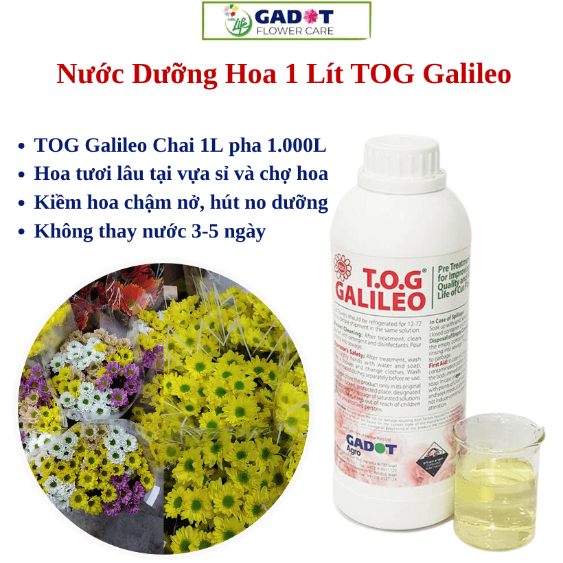 TOG GALILEO là nước dưỡng hoa siêu đậm đặc, nhập khẩu Israel, chuyên dùng cho xử lý và bảo quản hoa tươi cắt cành ở quy mô lớn.
