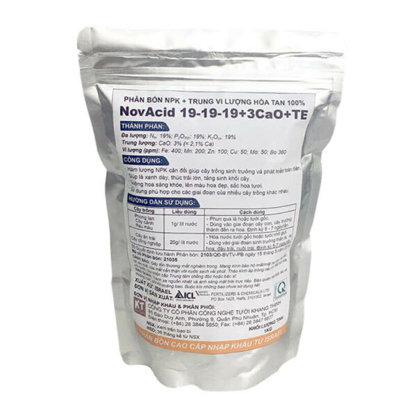 Phân bón NovAcid 19-19-19+Cao +Te Là phân hoà tan 100%, được nhập khẩu hoàn toàn từ ICL – Israel, Sử dụng tốt cho cây trong giai đoạn ra hoa, giúp cây tốt hoa – lớn trái, lá xanh dày, thúc đẩy sinh trưởng mạnh.