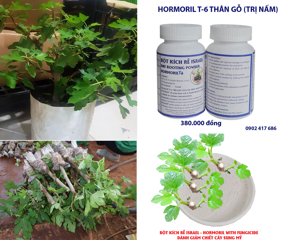 + Nhân giống cây sung mỹ được thử nghiệm với các bước GIỐNG NHAU từ hom đất, cắt cành … và chỉ khác là chia ra làm 2 chậu hoa có nhúng qua bột kích rễ Israel cây thân gỗ có trị nấm bệnh Hormoril T6 with fungicide và chậu hoa để tự nhiên