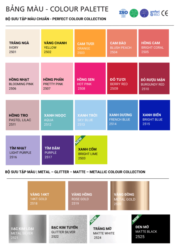 • Bảng màu đa dạng với tổng 25 màu, giúp florist dễ dàng sáng tạo nhiều phong cách hoa khác nhau