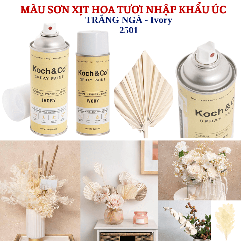 Sơn Xịt Hoa Tươi Nhập Khẩu Úc – Trắng Ngà Ivory 2501 tone màu nhẹ nhàng tinh tế thể hiện được sự thanh lịch, tự nhiên; tạo nên cảm giác mềm mại và sang trọng cho hoa tươi – hoa sáp. Tone màu Trắng Ngà Ivory thường được dùng làm nền màu, che khuyết điểm cho cánh hoa, giúp làm dịu các tone màu quá mạnh khi các Florist cần tạo hiệu ứng màu Pastel hoặc mix màu bóng mờ – ombre long cho tác phẩm