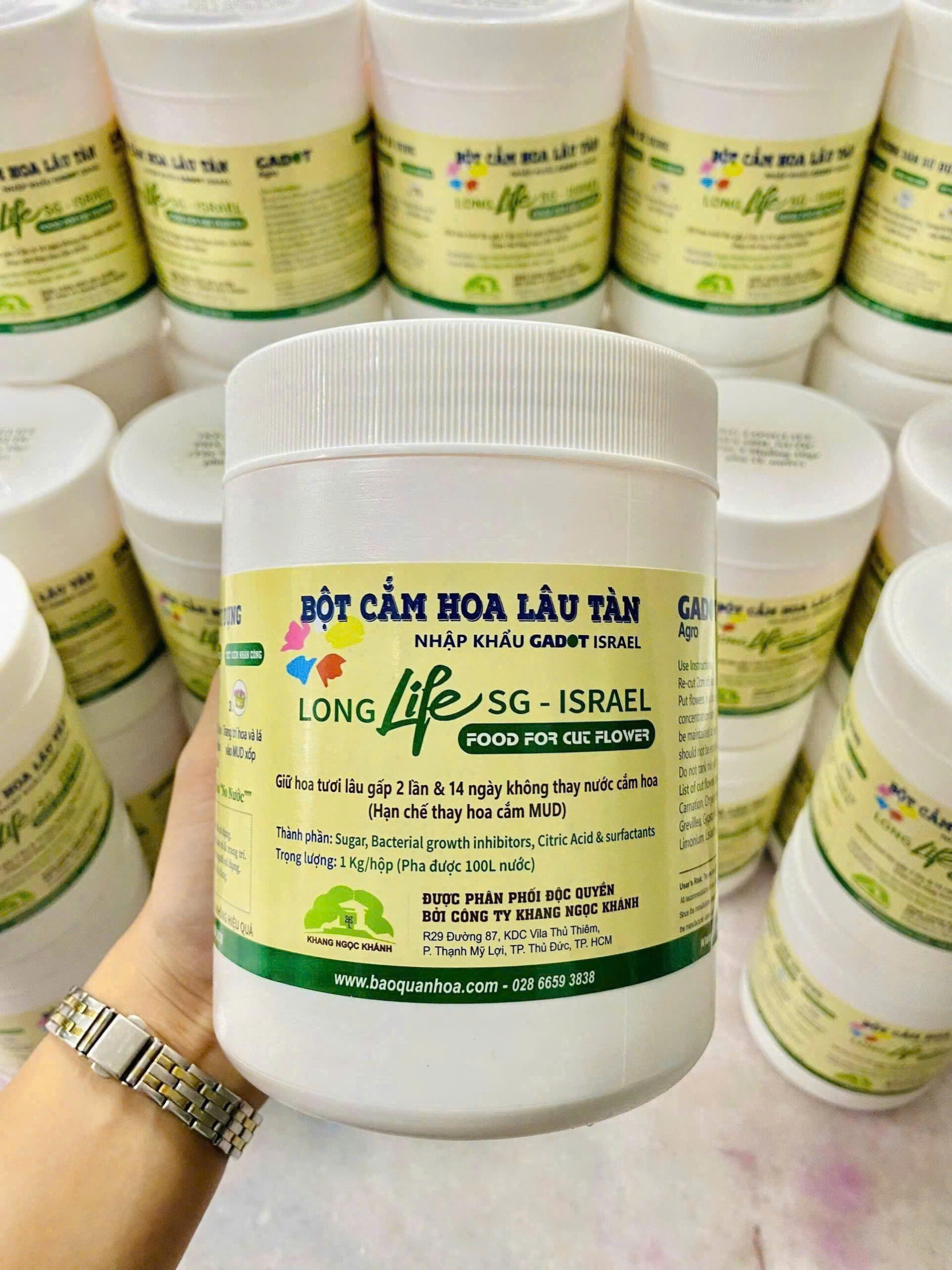 Bảo Quản Hoa Cắm Xốp Bằng Dung Dịch Cắm Hoa Lâu Tàn Israel – Food for cut flowers cho shop hoa, vựa hoa và chợ hoa là Thuốc Cắm Hoa Tươi Longlife SG 1KG giúp kích hoa nở tại Shop và 15 ngày không thay nước mới