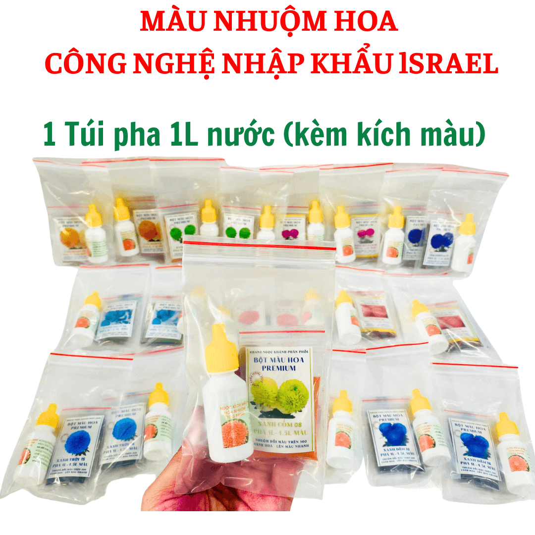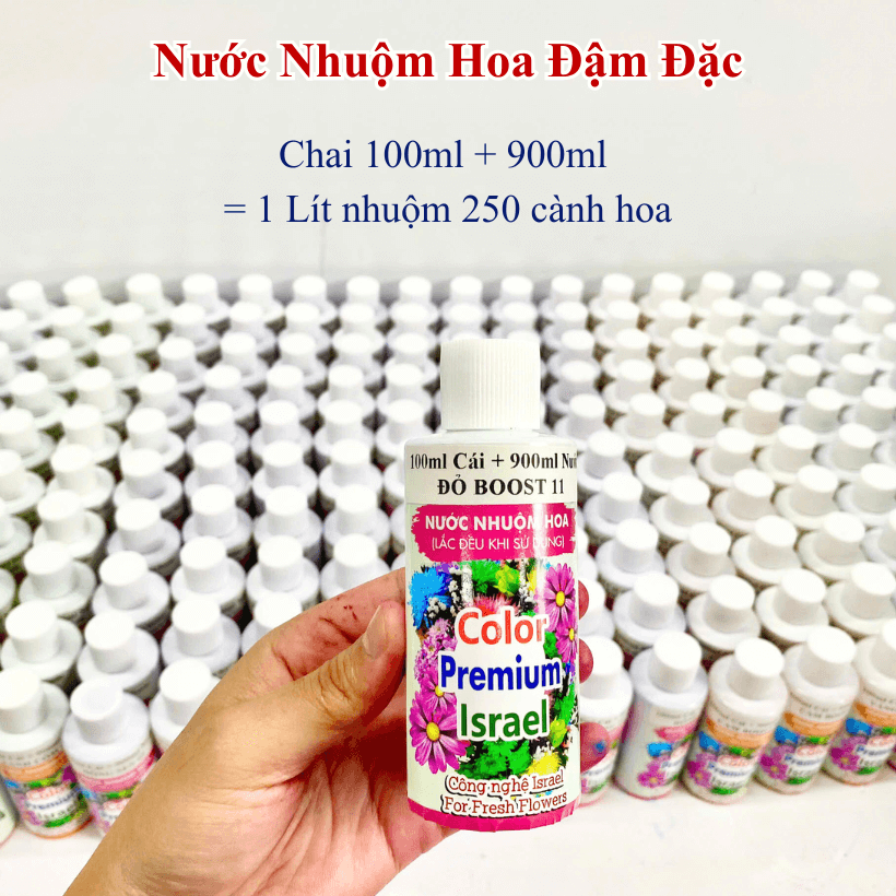 Thuốc Nước Nhuộm Hoa Tươi Cao Cấp được trộn từ Bột Nhuộm Hoa Tươi Nguyên Liệu chuyên dụng cho hoa tươi an toàn và nhập khẩu công nghệ Israel GỒM (Bột Màu Hoa + Nước Kích màu bột hoa nhuộm + Nước sạch) với 2 loại đóng gói: Chai nước màu 1L hoàn chỉnh và chai nước màu 1L Đậm Đặc pha 10L nước hoàn chỉnh