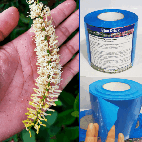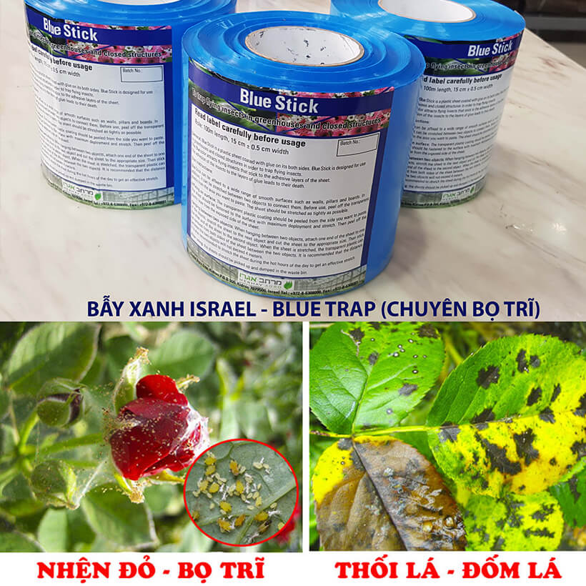 + Bẫy màu xanh bọ trĩ, Blue Trap: Ngang 15cm x dài 100m x 2 mặt keo dính. Chống tia UV và chịu mưa nắng hiệu quả